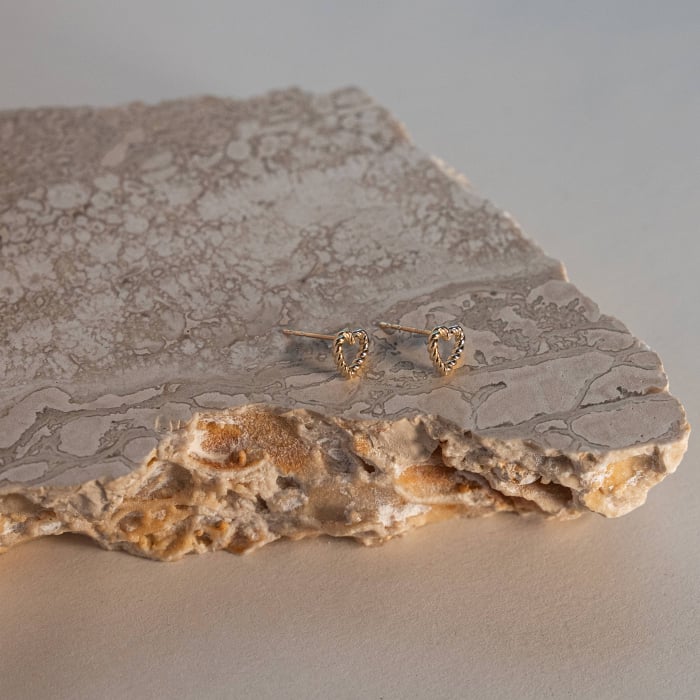 These 10K yellow gold open heart stud earrings feature a delicate roped design that adds dimension and subtle shine. Crafted in solid gold, they’re lightweight, comfortable, and perfect for everyday wear.